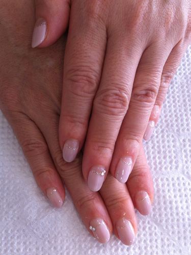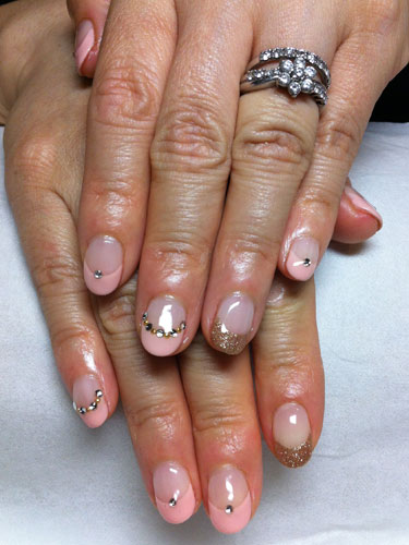 右手は人差し指、左手は薬指だけゴールドで… 後の指は、ピンクのフレンチをカルジェルでしてもらいました。 ピンクのフレンチには、ひとつずつストーンを置いてます。 1本ずつ色が違うネイルって、ちょっと新鮮!