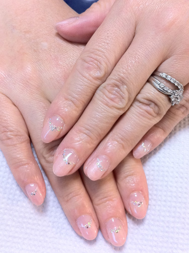 薄いピンク(←いろんな色を混ぜて作ってくれました…)のカルジェルを逆フレンチに塗り、境目にラメで線を描いてもらいました。 カルジェルに、貝殻の粉のようなものを混ぜてくれたのですが、とても控えめにキラキラ… 上品でお気に入りです!
