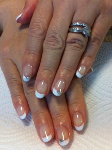 カルジェルでフレンチネイルにしてもらいました。 右手の親指・中指、左手の人差し指・薬指にストーンをつけてもらいました。 フレンチネイルは、とてもの上品… 大好きなネイルです!