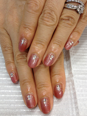 少し大人っぽい色のネイルにしてもらいました… 爪の根元にゴールドのラメを塗り、2個ずつストーンをのせました。 短めのネイルには、濃い色が似あいますネ!