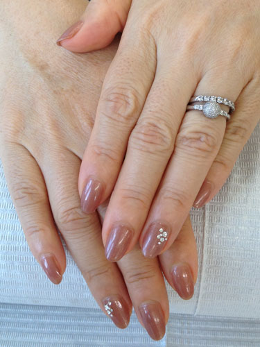 全体に、ちょっと濃いベージュのネイル… ベージュというより、薄いブラウンかな?の、ジェルを塗ってもらいました。 前々回も、同じような色だったのね…(過去の投稿を見て気付きました… 笑) 両方の薬指には、ストーンをいくつかずつ付けました。 シンプルですが、指が綺麗に見える色です。
