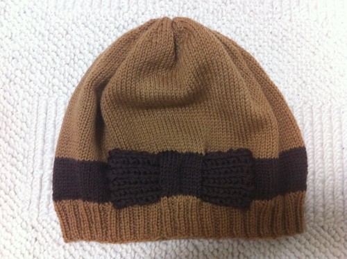 大きなリボンのついたニット帽子を編みました。 どんなことになるかな?と思いながら編みましたが、できたらとても可愛かった♪ もっと大きなリボンにしてもいいかも…?