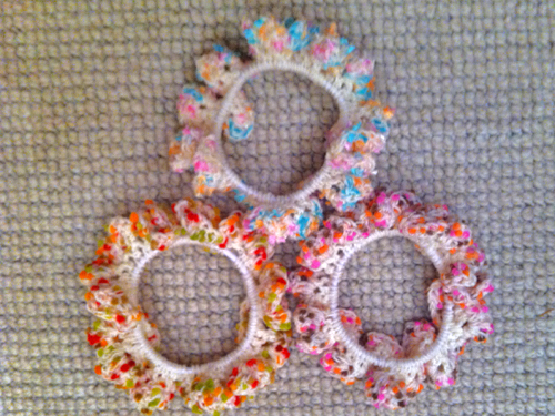 こちらは、リボン糸を編み込んだシュシュです。 こんなの編んでみたらどーかな?と思い立って作った新作です! 思ったより、ずーっと可愛いのであっという間に3つ編みました。