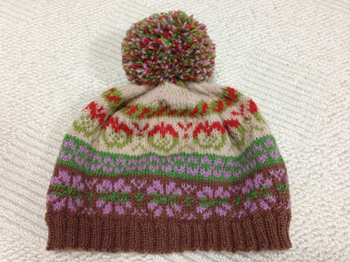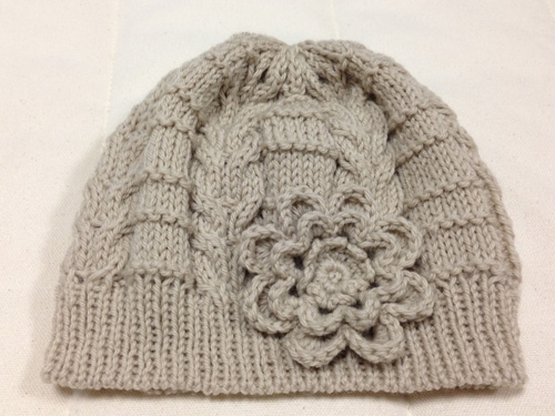 いつものように? 帽子をいろいろ編みました! 薄いベージュの棒針編みの帽子です。 お花の飾りもつけてみました!