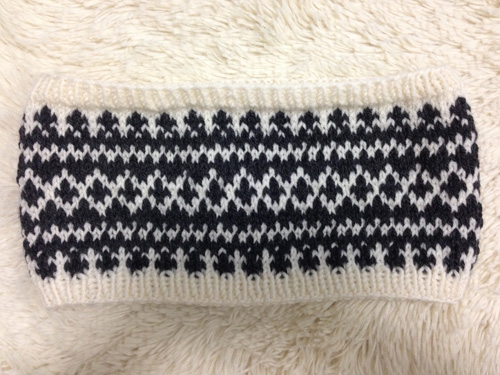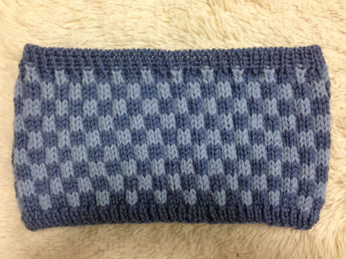 模様を編むのが楽しくて… ヘアバンド(ターバン?)もいろいろ編みました! 濃い青と水色のチェック柄のヘアバンドです!