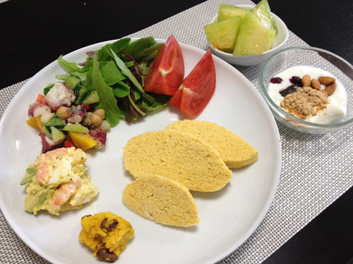 かぼちゃとさつま芋で作ったサラダをのせて食べるのが、私のお気に入りです。