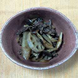 - フライパンにサラダ油小さじ1を入れて熱し、牛肉を炒め、色が変わったら取り出し、サラダ油小さじ1を足し、れんこん、ごぼうを炒め、だし汁、砂糖、薄口醤油、みりん、酒を入れて汁気がなくなるまで炒め煮にし、根菜が煮えてきたらしめじを入れ、牛肉をもどし入れて全体をよく混ぜる。