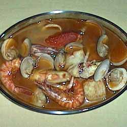 - グツグツしてきたら、ふたをあけ、魚介類の見崩れをおこさないように注意してかき混ぜ、さらに弱火で魚介類が煮えたら、盛りつけ、パセリのみじん切りをかける。