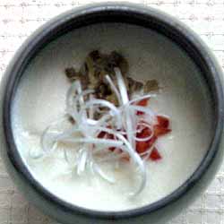 水200ccでコンソメを煮、豆腐を入れて静かに煮、ふつふつしてきたら牛乳を加えて少し煮、水溶き片栗粉を入れて少し煮たら出来上がり。