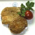 フライ衣はなるべく薄くつけて、手で軽く押さえるようにしてなじませ、少しの間、冷蔵庫でねかせるとしっとりとして揚げやすくなるよ。